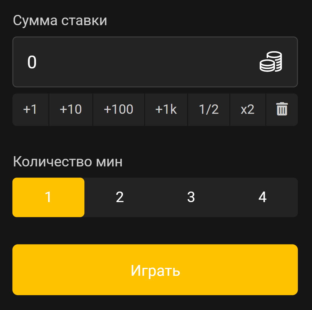 Введите сумму ставки, выберите количество мин в ряду и нажмите кнопку "Играть"