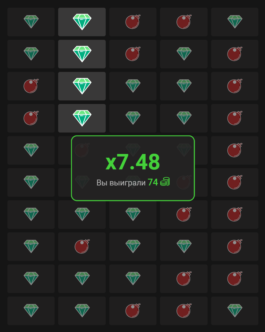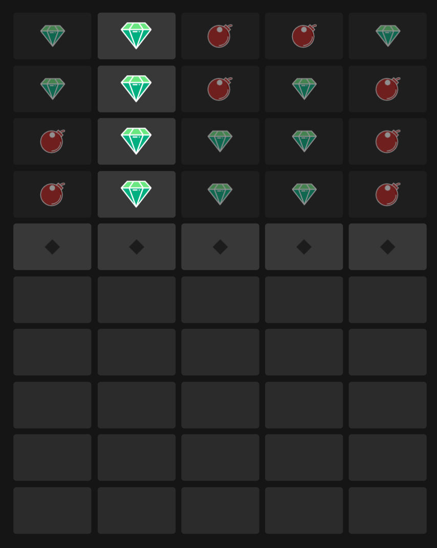 Башня состоит из 10 уровней, каждый уровень представляет собой 5 ячеек. Вам предстоит проходить уровень за уровнем, открывая одну ячейку на каждом. Если в ячейке содержится кристалл — вы проходите дальше, если мина — вы проигрываете.